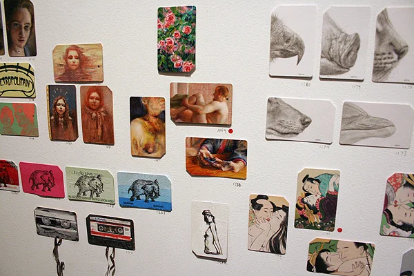 There are two thousand lucky New York City MetroCards upcycled as zoetropes, impressionist cityscapes, shunga-stylized erotica panels and nail-polished pug portraits at the Single Fare 2: Please Swipe Again exhibit, and we stopped by the Sloan Fine Artgallery opening last week to see them. Some are festive. Some are sexy. Some are a freaky combination of both, unfolding like a comic strip as a Jeff Koonsian balloon animal gets amorous with a Dalmatian furry.
