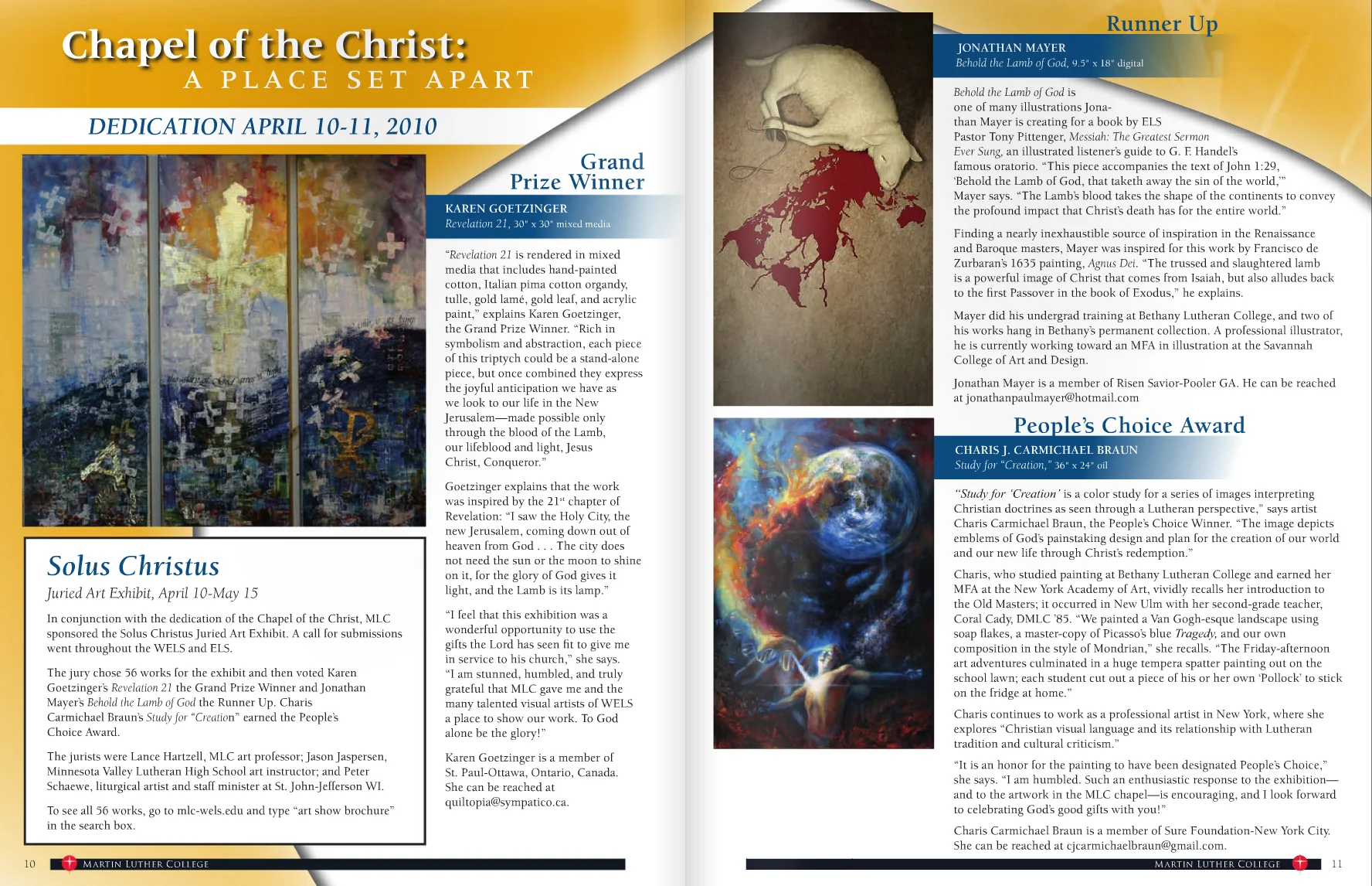 originally published: https://issuu.com/mlc.edu/docs/2010_infocus_june OR Gauger, Laurie. "Chapel of the Christ: A Place Set Apart, Solus Christus Juried Art Exhibit." In Focus (Year In Review: 2009-2010): pg 10-11. Print.