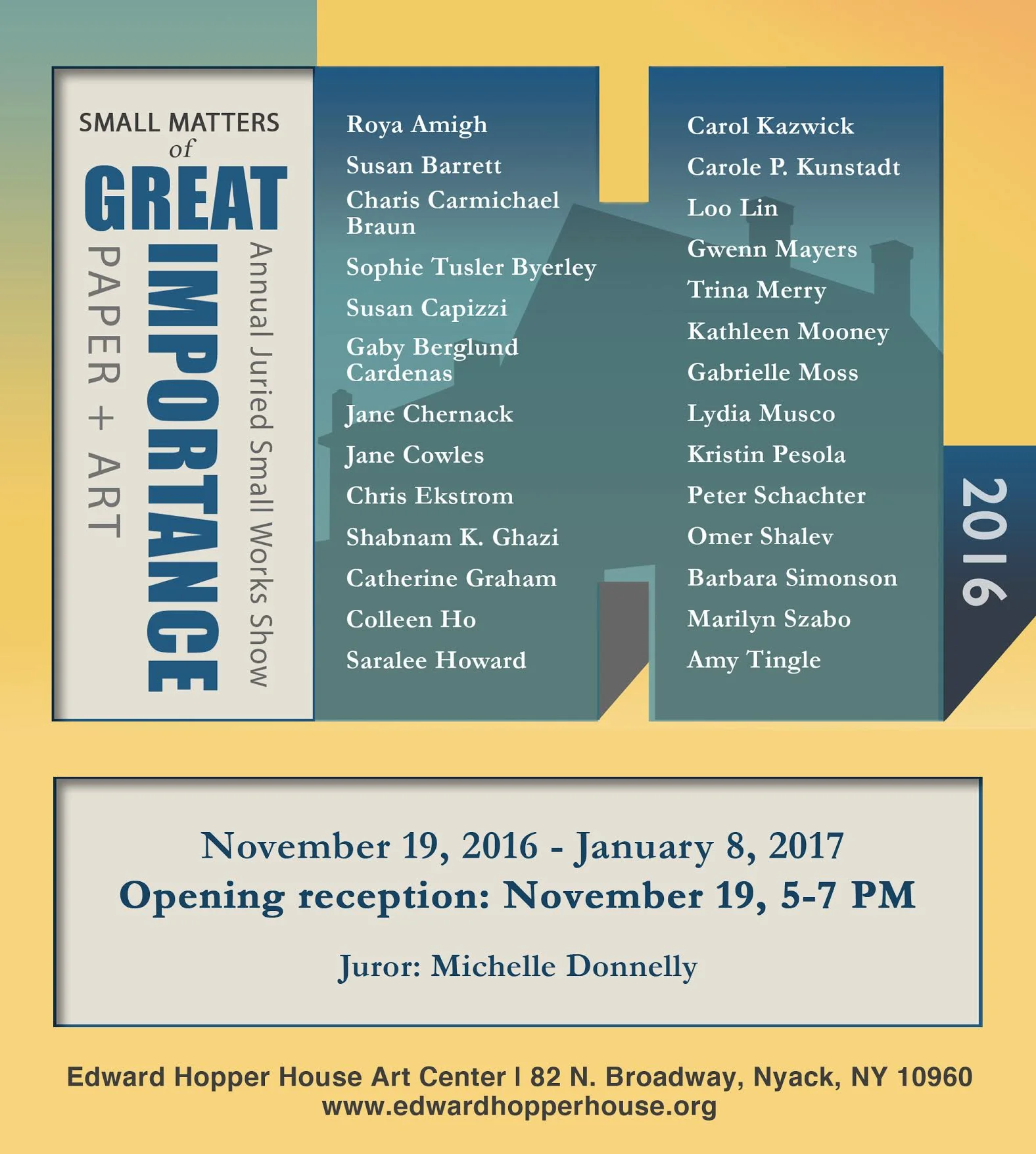 I'm pleased to have 3 pieces of artwork included in the Edward Hopper House's Annual Juried Small Works Show. The theme of this year's juried show is artworks on and works of paper. The exhibition was juried by Michelle Donnelly, Curatorial Fellow at the Whitney Museum of American Art.